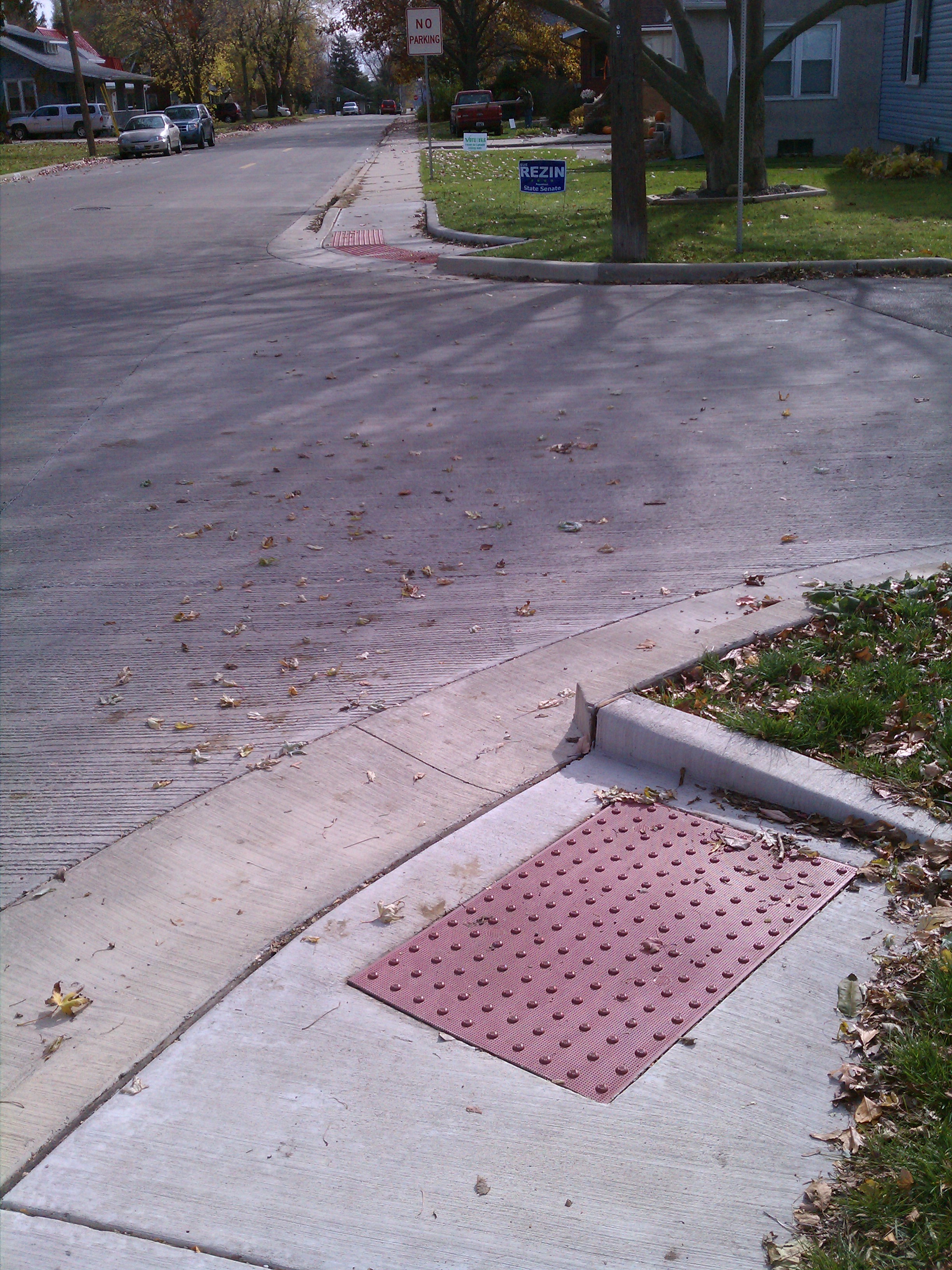 The problem does not seem to be relegated to only residential streets, either. Bucklin Street is a fairly main throughway and, at least in this neighborhood, does have sidewalks. But the corner crossings which have recently been set up seem determined to discourage anything so healthy as walking, let alone anything extreme like jogging (Jogging! Lord, we can’t have that!)