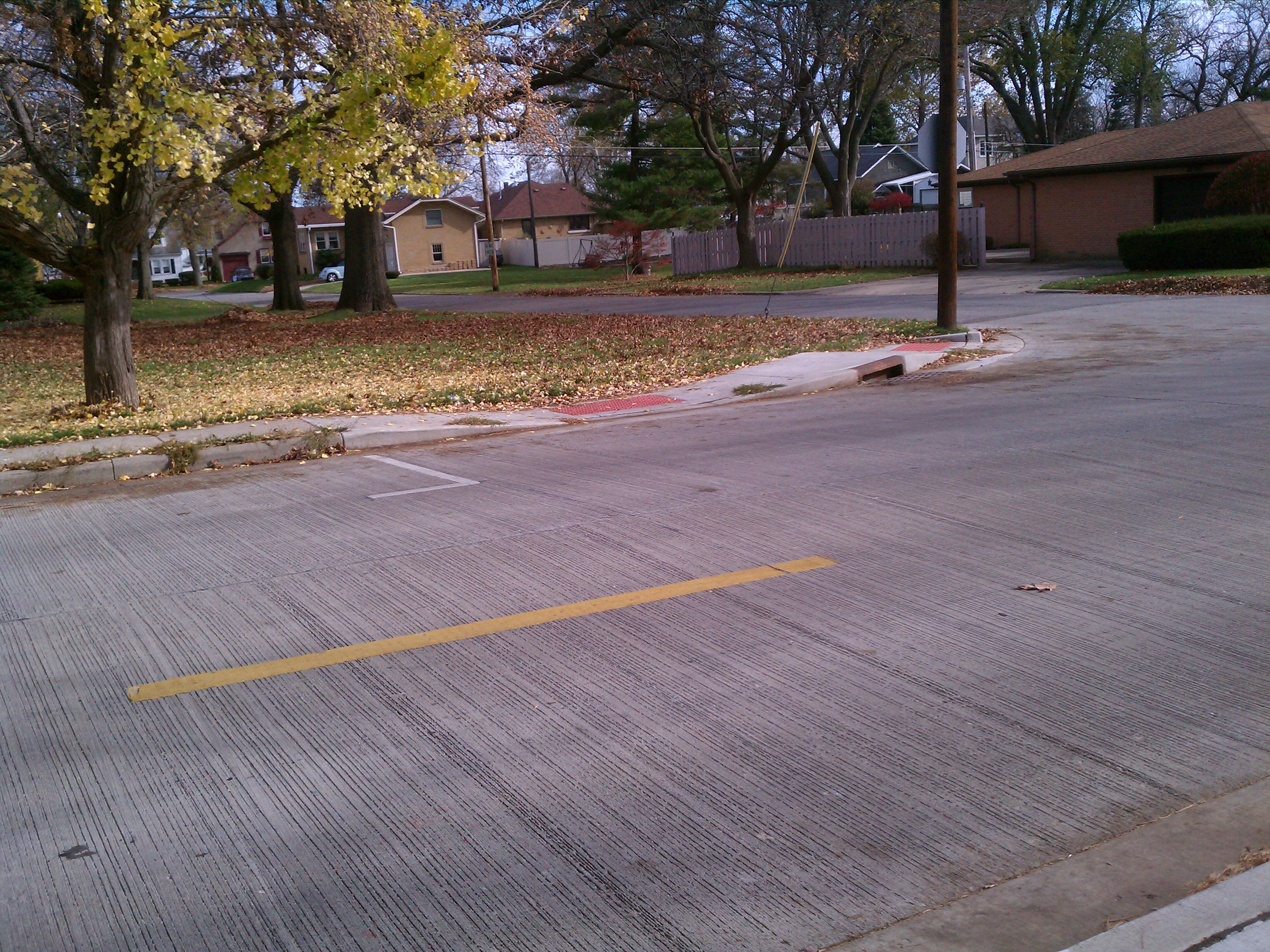 On the final corner before heading back right along the last (sidewalk-less) block home, the city planner seemed to be getting the idea. The curve (Figure 5) is placed so that you can walk either forward or turn left, though there is a distinct prejudice in favor of forward.
